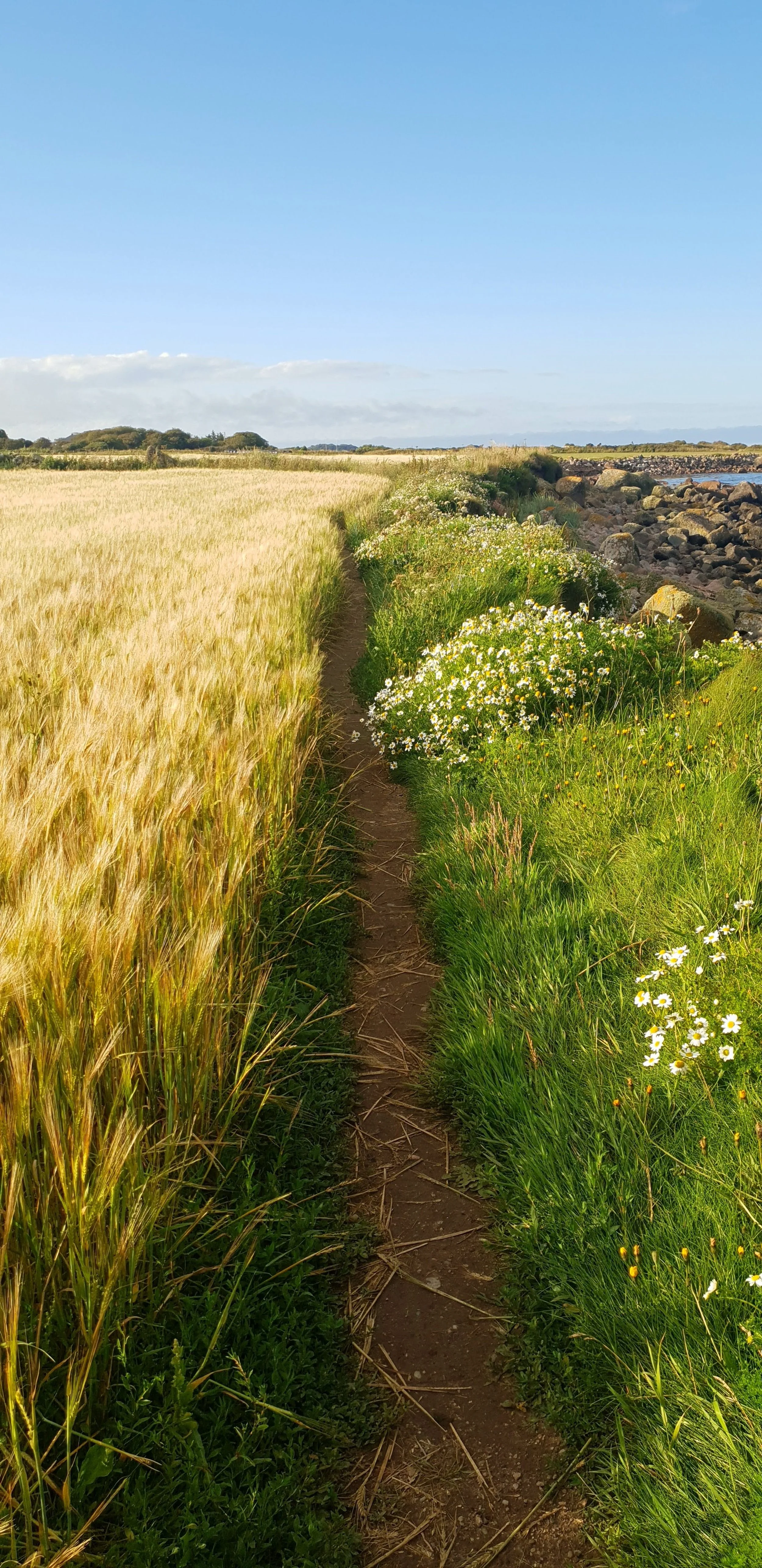 As the journey continues northward across the headland, the harshness softens. We pass through stretches of low-lying farmland, where wild hedgerows offer momentary shelter and birdsong returns to the air. Insects buzz among the grasses and sea pinks, and the barley hums with a quiet energy all its own.