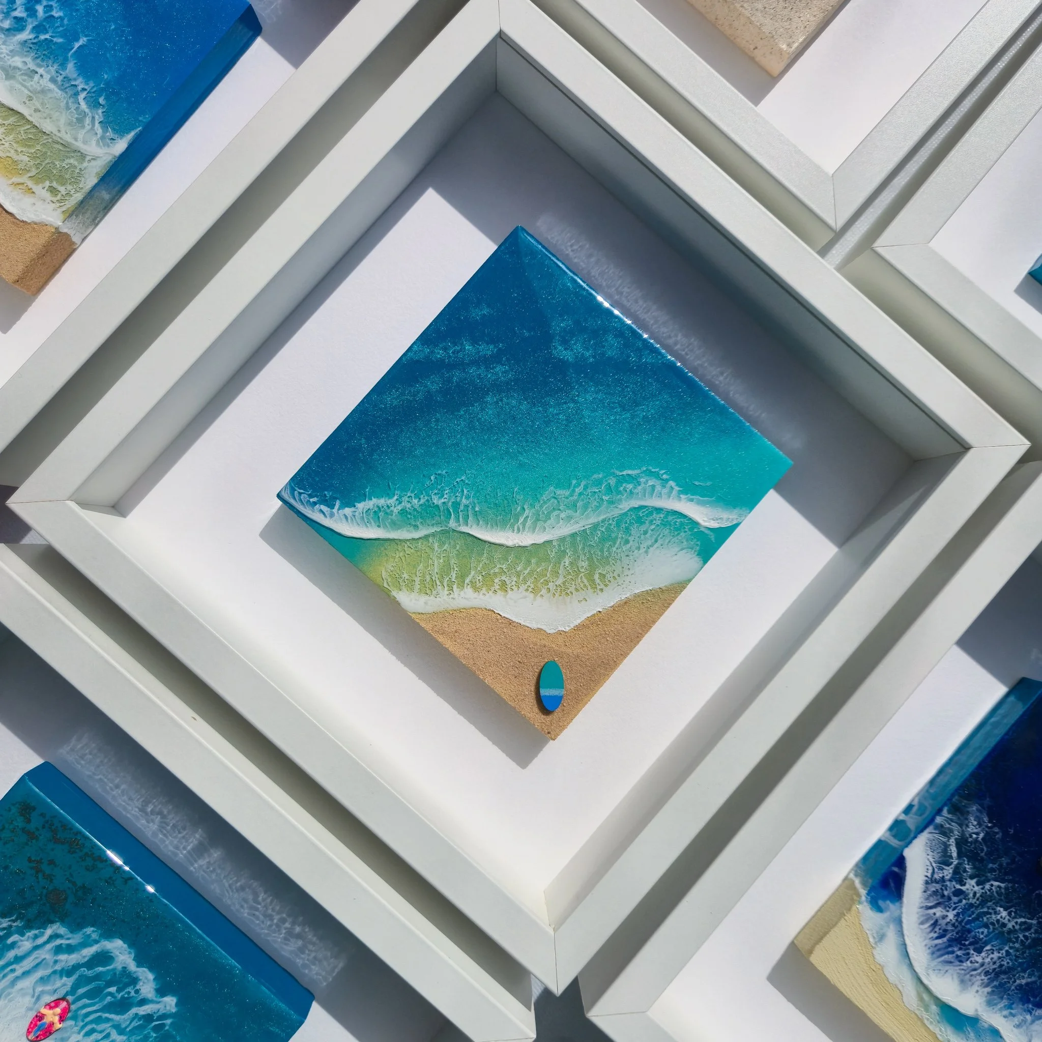”Tide & Seek” captures the essence of a sunlit coastline, where the gentle waves of the ocean meet the soft sand of the shore (made with real Irish sand). The vibrant blues and teal hues shimmer with iridescent pigments, reflecting the calming beauty of the sea. The artwork's texture invites you to feel the ocean’s rhythm, while the soft sand provides a grounding balance. A perfect addition to any coastal-inspired space, Tide & Seek brings a piece of the ocean into your home, offering both tranquility and the vibrant energy of the sea.