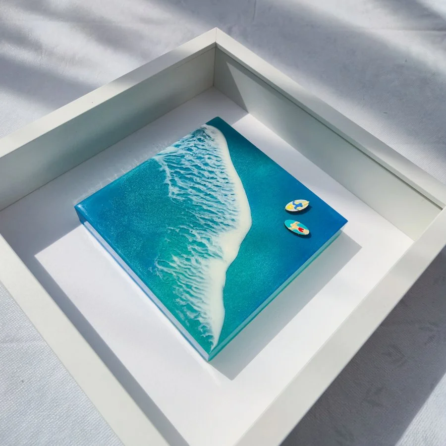 Held by the Tide captures a tranquil moment where ocean energy softens into stillness. Made with real sand, with delicate whites curling over emerald-green shallows and real Irish sand at the shore, this original framed resin artwork evokes the feeling of being gently cradled by the coast. Its layered, glasslike surface glows with depth and movement, bringing the serenity of the sea to your space in a refined, compact form.